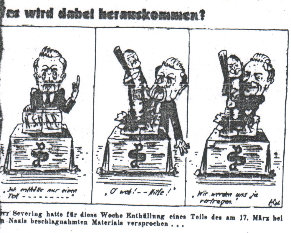 Abgebildet sind der preußische sozialdemokratische Innenminister Carl Severing und Adolf Hitler. Die Syndikalisten sahen in der Sozialdemokratie die seichte Form kapitalistischer Herrschaft, und im Faschismus die harte Gangart. Zudem hat die Sozialdemokratie mit der Niederschlagung der revolutionären Arbeiterbewegung in Deutschland Anfang der 20-er Jahre der Machtübernahme der Faschisten 10 Jahre später den Weg geebnet. Die SPD sei der „Schrittmacher der Reaktion“, so hieß es in der syndikalistischen Presse.